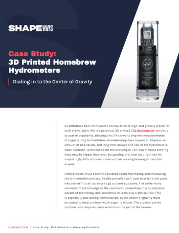 Tilt Hydrometer CEO Noah Neibaron has no problem with ordering 3D printed prototypes from Shapeways until achieving perfection. During product development for the free-floating tilt hydrometer, Neibaron was able to test for functionality, check density of the materials, and examine all parts of the 3D printed device used to measure fermentation. Ultimately, final parts were 3D printed and then assembled by Tilt, calibrated, and shipped.